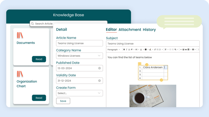 Create a knowledge base to ensure internal information continuity for your teams. Increase knowledge sharing and strengthen collaboration by sharing articles, downloads, and templates.