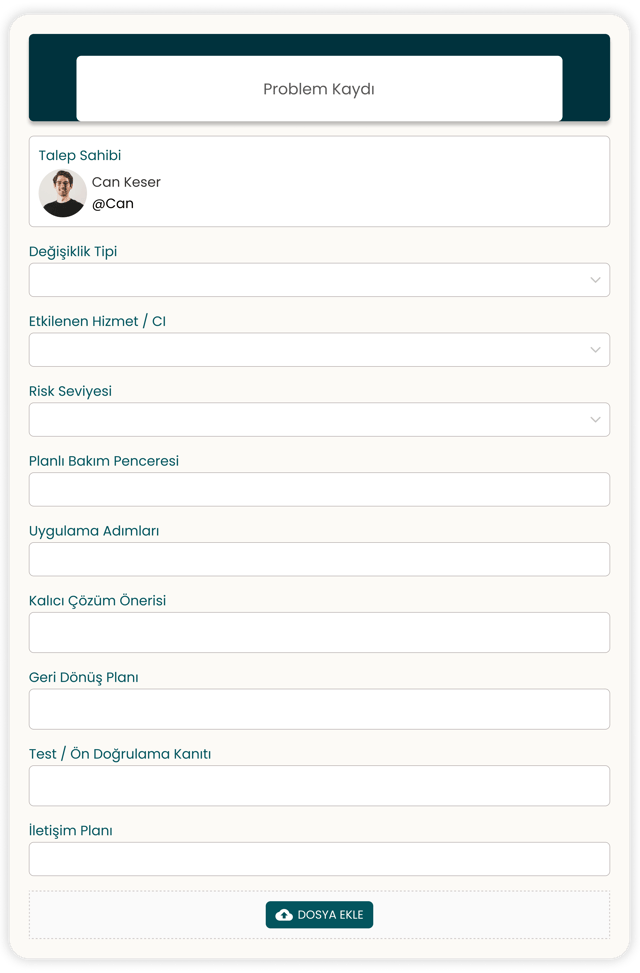 ITIL 4’te “Change Enablement”, değişikliklerin iş değeri üretirken hizmet sürekliliğini korumasını amaçlar. Stoneity ile değişiklik taleplerini (RFC) sınıflandırır (Standard/Normal/Emergency), risk ve etki değerlendirmesi yapar, gerekli onayları (CAB dahil) otomatik akışlarla toplar ve uygulama sonrası doğrulama/raporlama ile izlenebilirlik sağlarsınız.